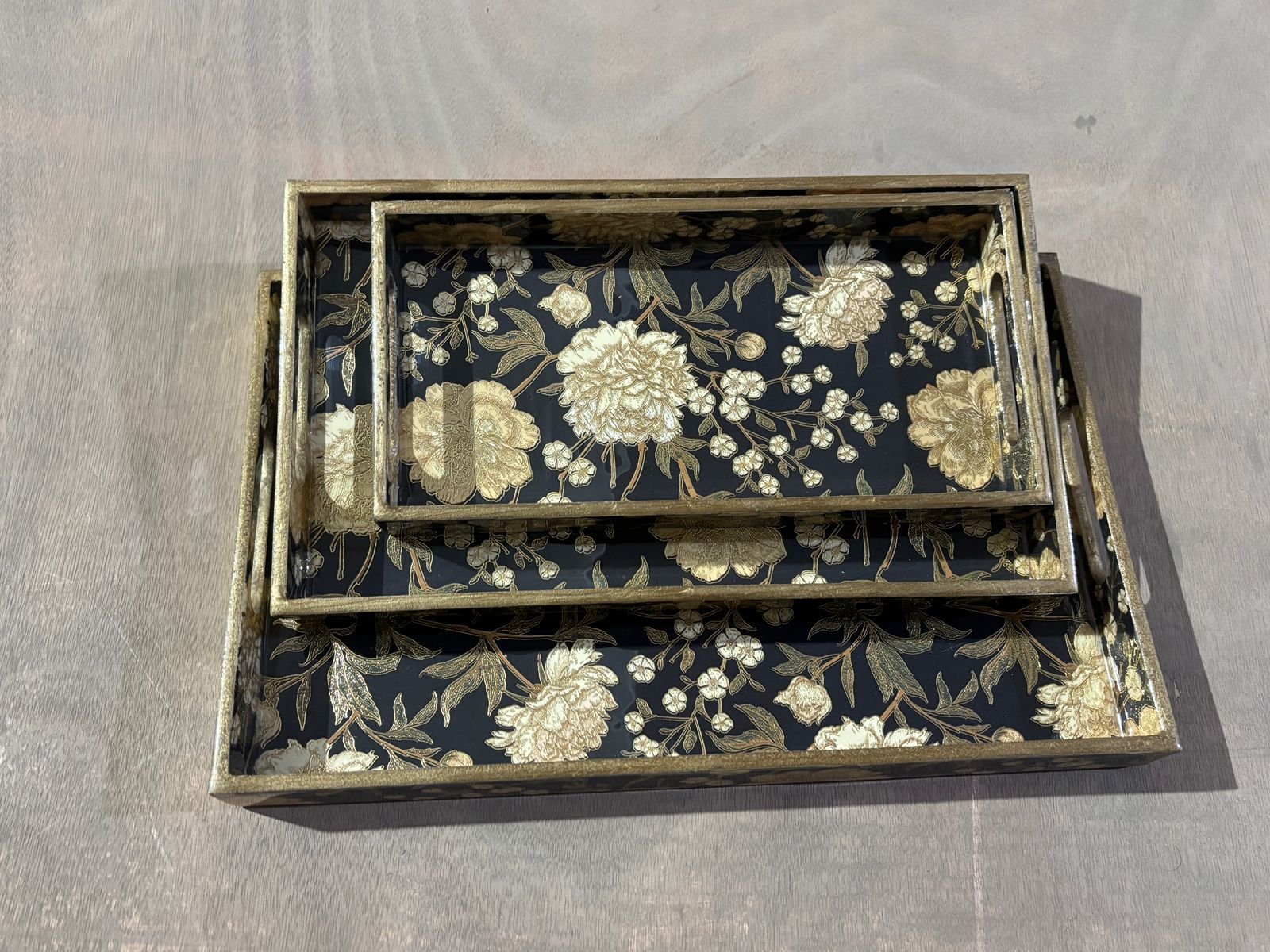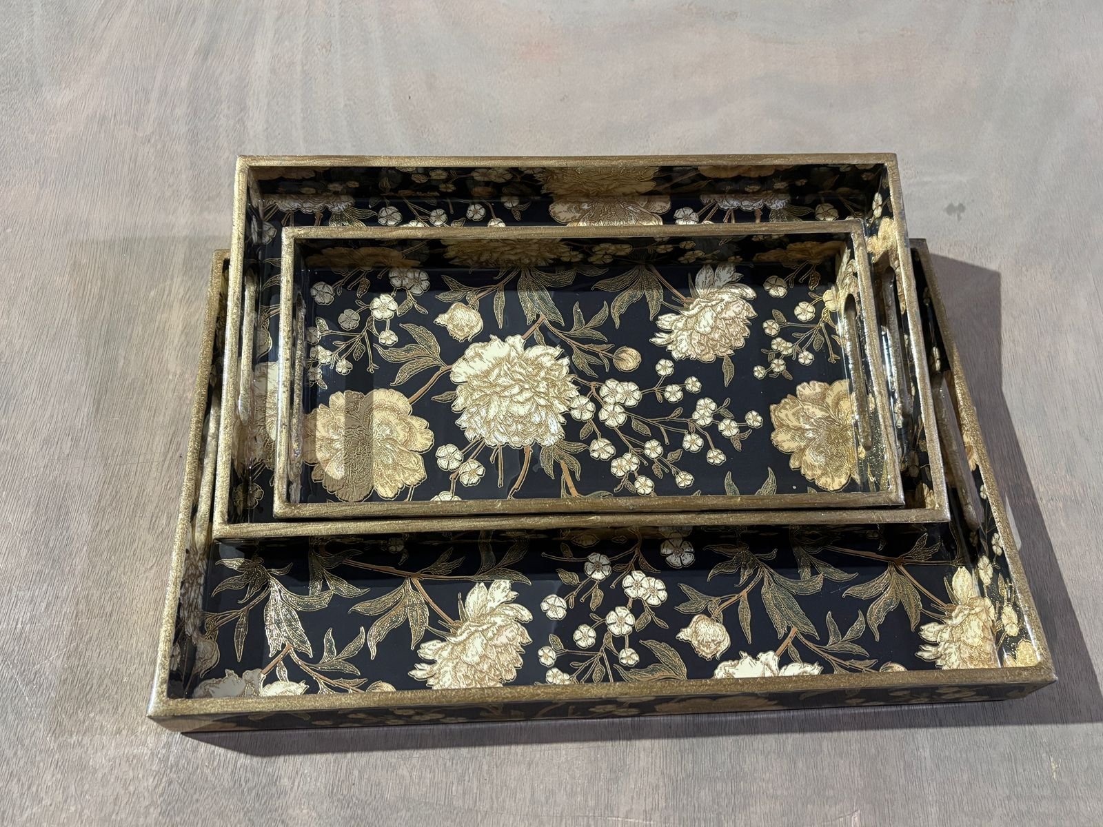 BLACK GOLD FLOWER MDF TRAY SET 3PC